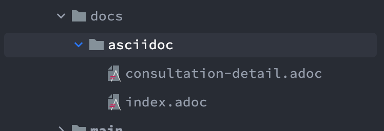 위 사진은 우리가 직접 생성해야하는 파일들입니다. consultation-detail.adoc은 자동으로 생성해준 snippets파일중 원하는 파일만 골라 모아준 파일이고 이런 각 api들을 한번 더 모아주는 파일이 index.adoc입니다.